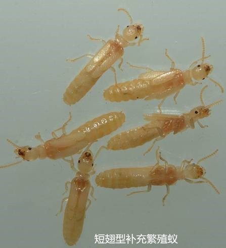 補(bǔ)充繁殖蟻有兩類:短翅型(或稱成蟲第二型)和無翅型(或稱成蟲第三型)。此種現(xiàn)象在較高級(jí)的白蟻科昆蟲的巢中比較少見。